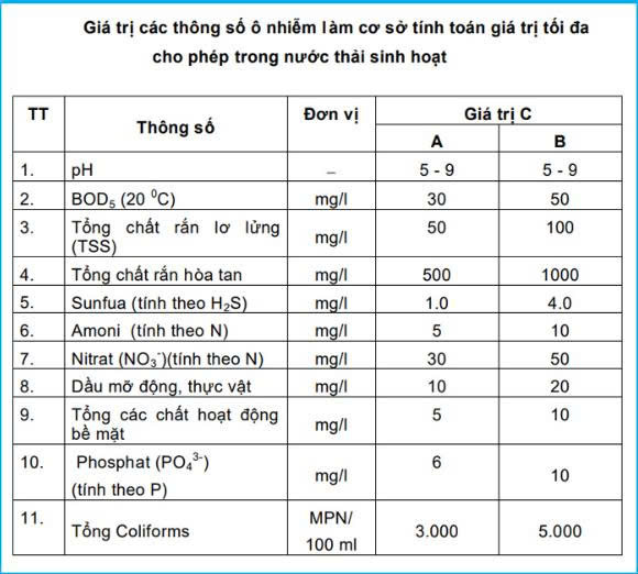 Giá trị C của các thông số ô nhiễm làm cơ sở tính toán giá trị tối đa cho phép Cmax trong nước thải sinh hoạt khi thải ra các nguồn nước tiếp nhận nước thải được quy định tại bảnh sau đây: