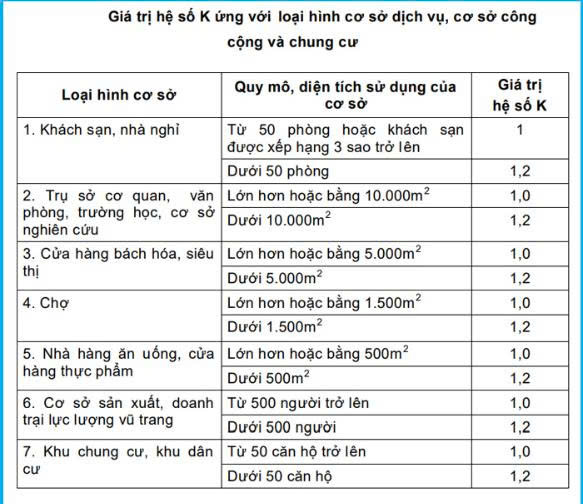 Tuỳ theo loại hình, quy mô và diện tích sử dụng của cơ sở dịch vụ, cơ sở công cộng, khu chung cư và khu dân cư, doanh nghiệp, giá trị hệ số K được áp dụng theo bảng dưới đây: